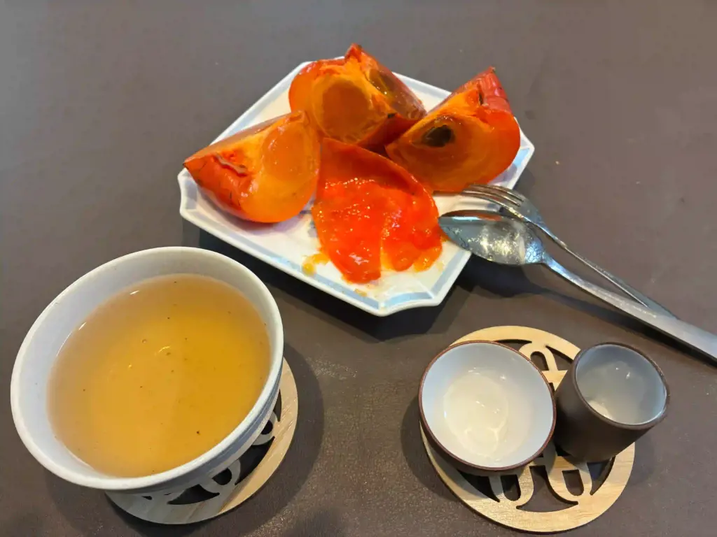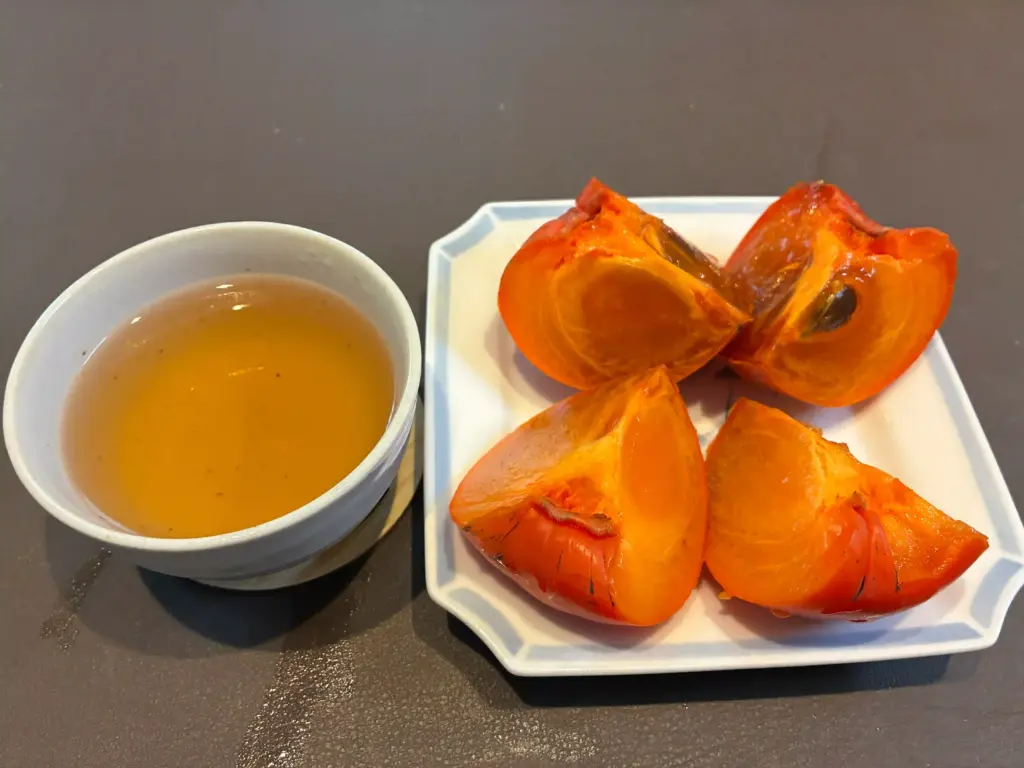 お茶の友はあまーい柿 硬いのも好きですが「ぐじゅぐじゅ」に熟れた柿も美味しいですね