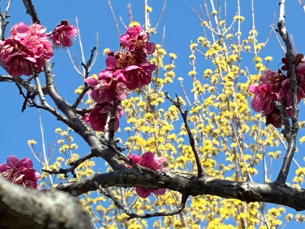 奥の黄色は「セイヨウサンシュユ」かな?